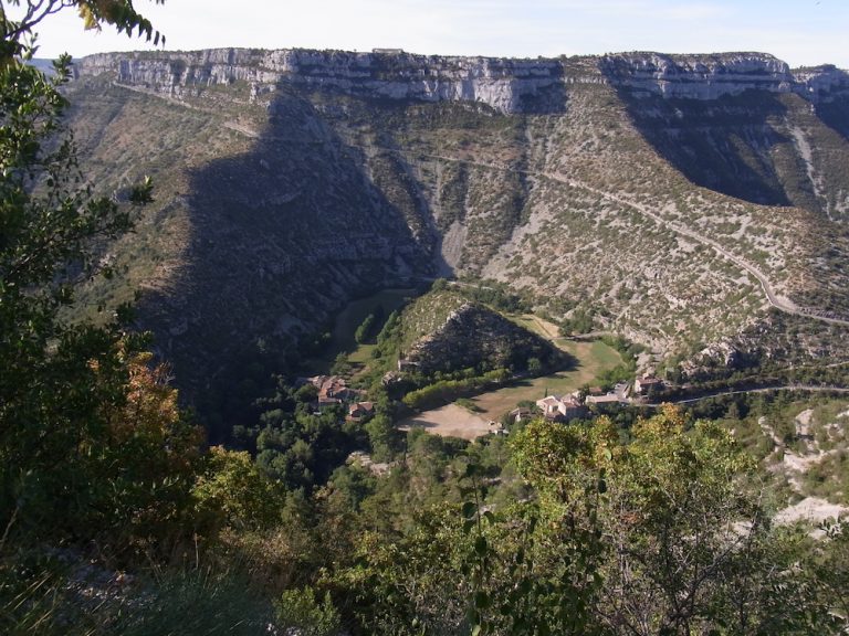 The place is the Cirque de Navacelles, an amazing huge hole in the ground caused by erosion, with very sheer sides – it is entered and left by roads that descend steeply clinging to the sheer edges. I am attaching a photo showing the road used on the way in from the rim, taken from our road out on the opposite side.